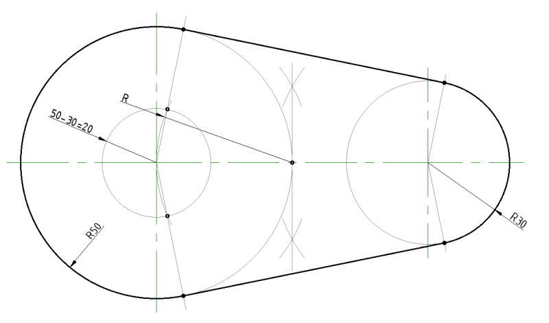 Primjer 2. Spajanje dvije zadane kružnice tangentnim pravcima.