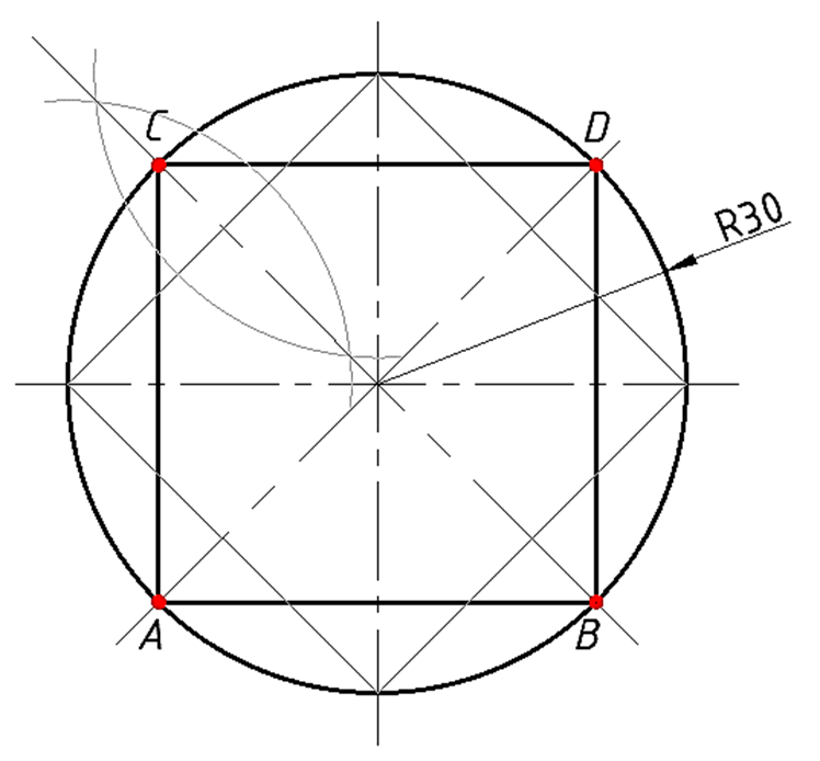 Primjer 2. Konstrukcija kvadrata upisanog u kružnicu zadanog polumjre. r = 30 mm