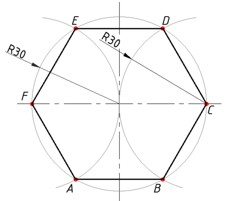 Primjer 1. Konstrukcija pravilnog šesterokuta upisanog u kružnicu zadanog polumjera. r = 30 mm