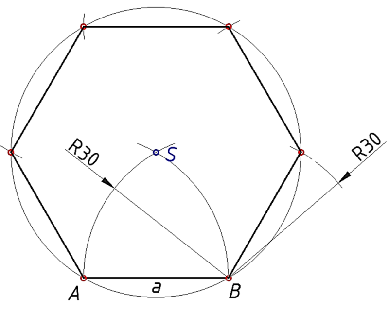 Primjer 2. Konstrukcija pravilnog šesterokuta zadane stranice a = 40 mm.