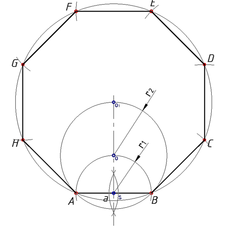 Primjer 1. Konstrukcija pravilnog osmerokuta kojemu je zadana stranica a = 30 mm.