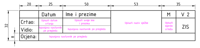 ○ Crtežu: mjerilo, naziv crteža, broj crteža, šifra vježbe
