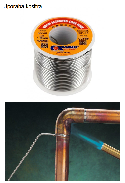 Kositar se upotrebljava kao dodatni materijal za lemljenje. Skup je pa se djelomično zamjenjuje olovom. Legura kositra i olova (SnPb) se primjenjuje za postupke spajanja mekim lemljenjem. Legura se označava brojem koji kaže koliko je kositra u leguri, npr. legura Sn70, u sastavu ima 70% kositra.