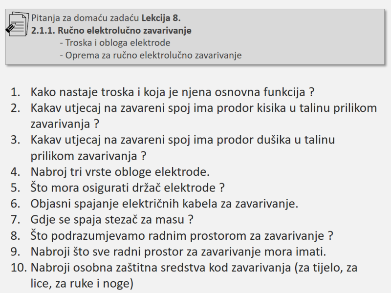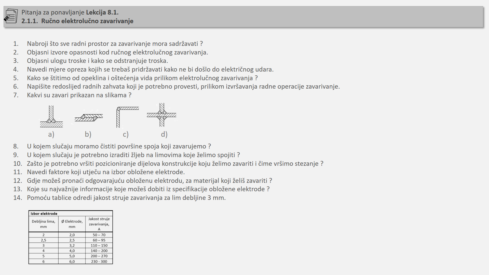 U ovom radnom zahvatu treba opisati na koji način se vrši izbor jakosti struje zavarivanja, koja se dokumentacija koristi, tablica ili proračun koji su neophodni za ispravno određivanje potrebne jakosti struje zavarivanja (Iz, A).