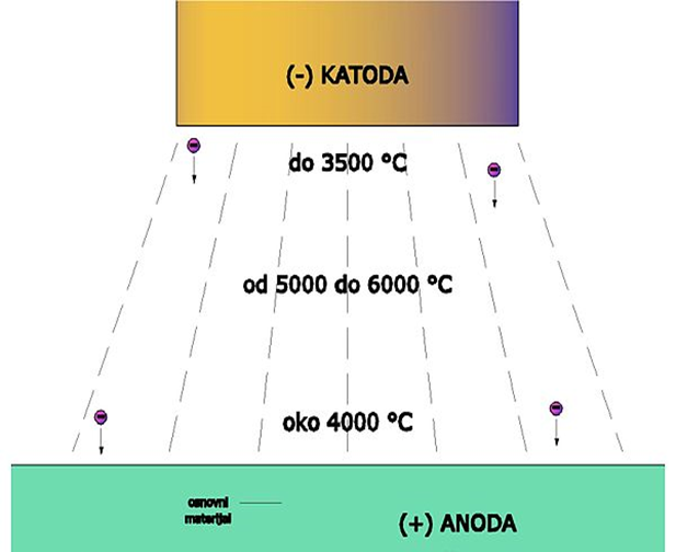 Električni luk razvija visoke temperature, na strani predmeta iznosi 4200 °C, strani elektrode iznose 3600 °C.