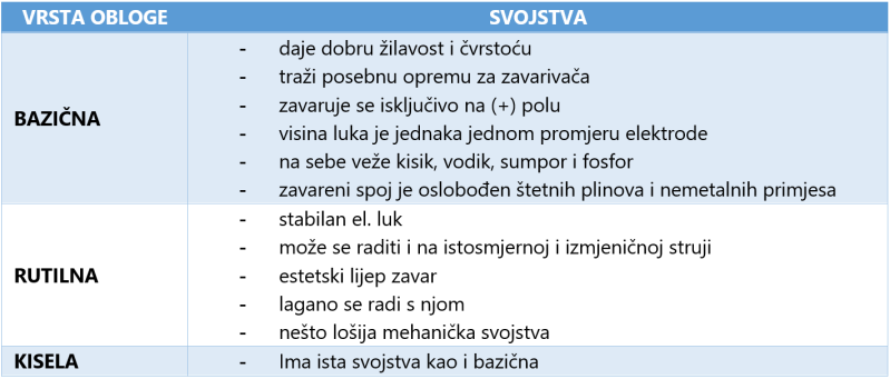 Postoje tri vrste obloga: bazična, rutilna i kisela, čija su svojstva navedena u tablici: