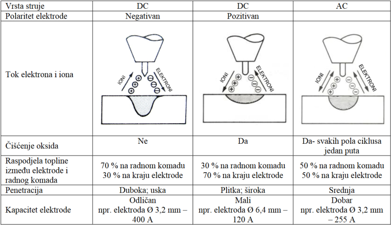 Neke od karakteristika TIG zavarivanja ovisno o vrsti struje i polaritetu: