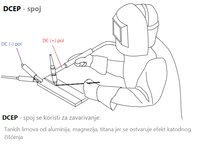 DCEN - je spoj na istosmjernu struju, s elektrodom na negativnom polu uređaja za zavarivanje