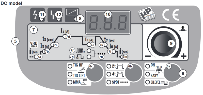 - automatski pulsirajući način rada gdje se mora postaviti samo GLAVNA STRUJA (I2). Ostali parametri kao npr. OSNOVNA STRUJA (I1), FREKVENCIJA PULSIRANJA i BALANCE mogu se regulirati automatski u skladu sa prethodno definiranim vrijednostima (I1 = 70% I2, FREKVENCIJA = 2Hz, BALANCE = 0). Navedene vrijednosti mogu se u svakom slučaju promijeniti.