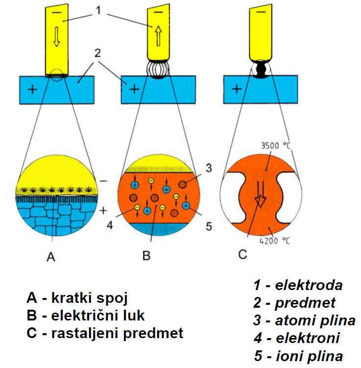 Električni luk se uspostavlja dodirom elektrode o osnovni materijal. Električni luk razvija visoke temperatura, koje na pozitivnom polu (predmetu) iznose 4200 °C, a na negativnom polu (elektrodi) iznose 3500 °C.